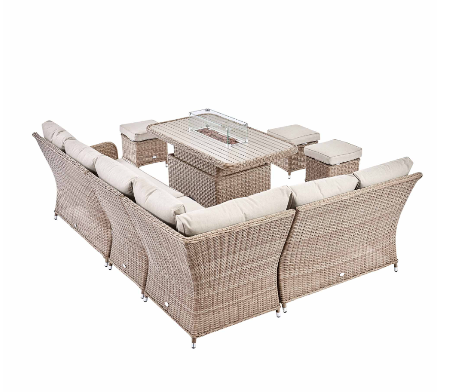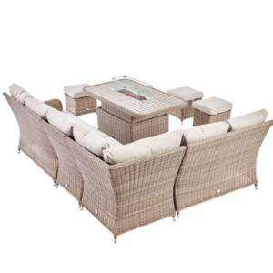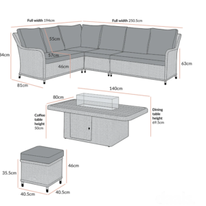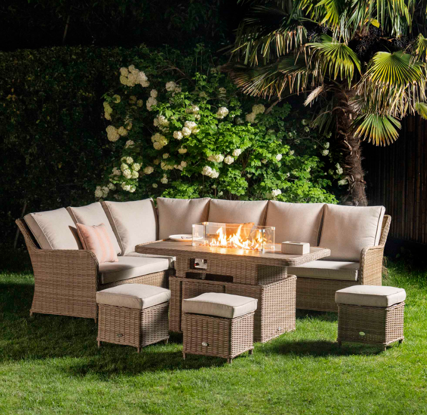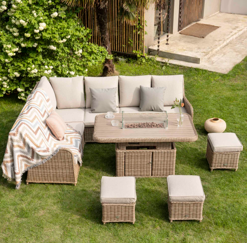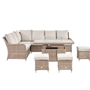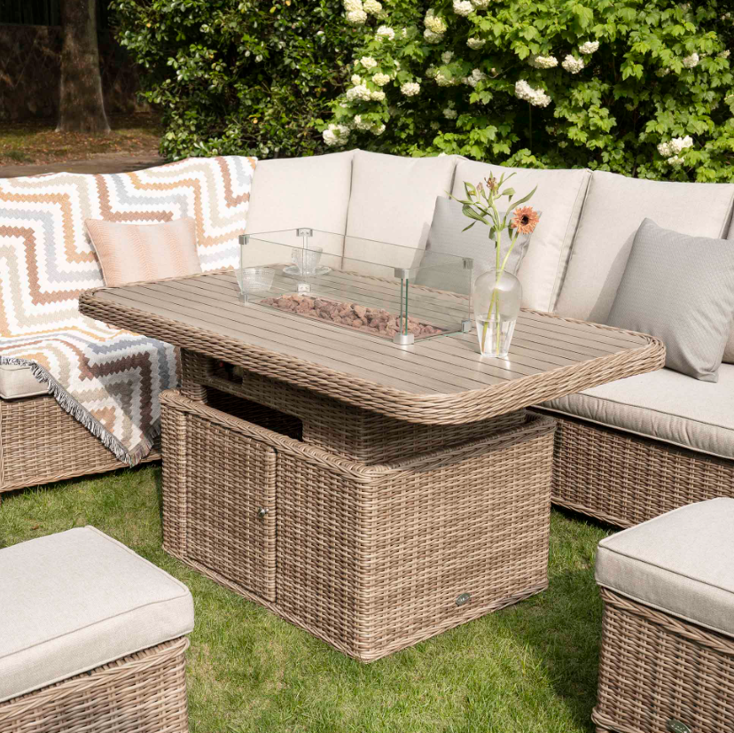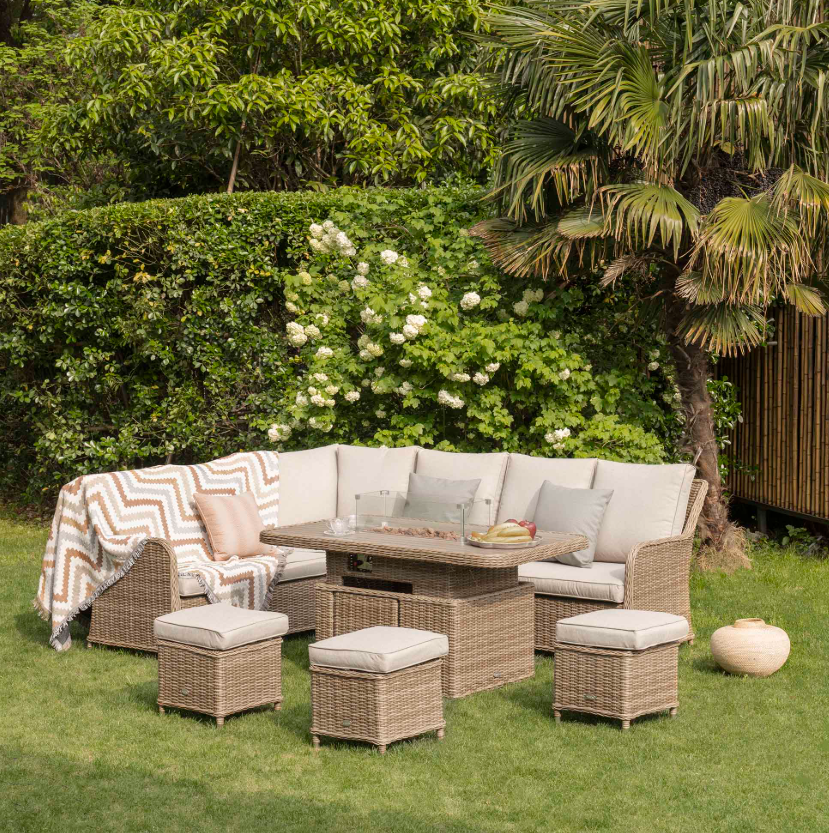 - Our Hampshire Large Corner Casual Dining Set with Rising Firepit Table is perfect for your summer garden parties.