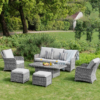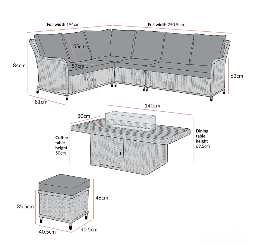- Crafted from UV resistant round and half all-weather wicker and full aluminium frame, the dining set comprises of a large corner sofa, 3 matching footstools which can be used as extra seating or as footstools, and a rising firepit table.