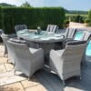 A Bellagio Round Wicker Large Corner Casual Dining Set with Rising Firepit Table, Light Grey
