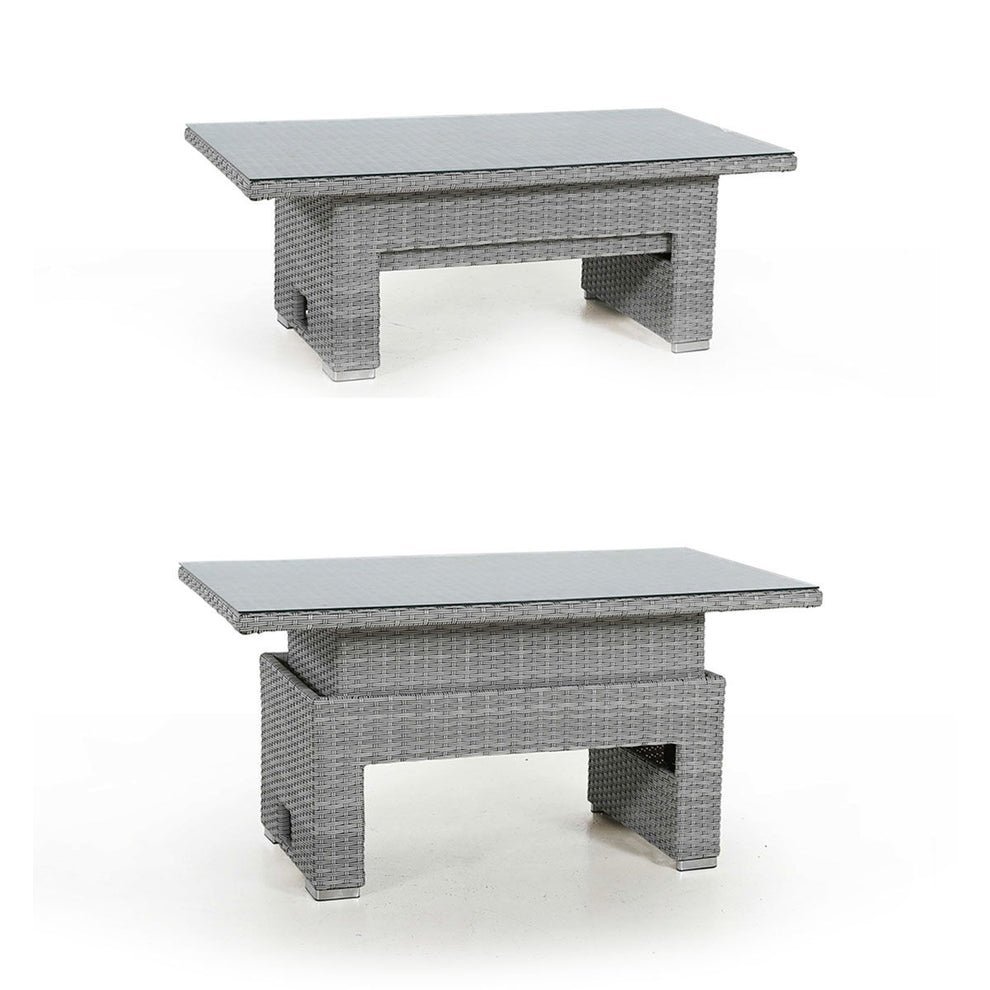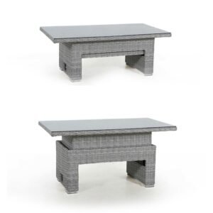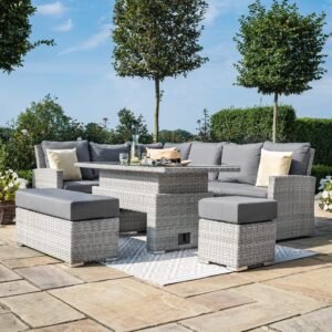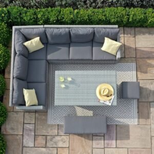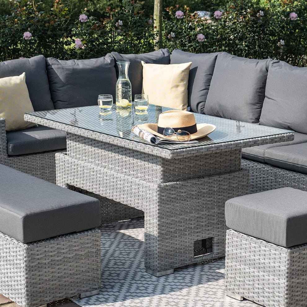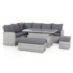 The Ascot Corner Dining Sofa Set with Rising Table allows you to move from day-time lounging to evening alfresco dining with the rising rectangular table combining functionality with comfort. The popular L shape sofa corner group complete with two varied length footstools allows for maximum seating whilst creating a stunning focal point to any garden. The cushions in the Ascot collection are coated internally with a water-resistant liner to prevent water permeation. Whilst the outer covers will retain water, they quickly dry in warm weather, so you won’t need to hurriedly collect them in any unexpected April showers. We do, however, advise that during prolonged periods of non-use or poor weather that the cushions are stored indoors.