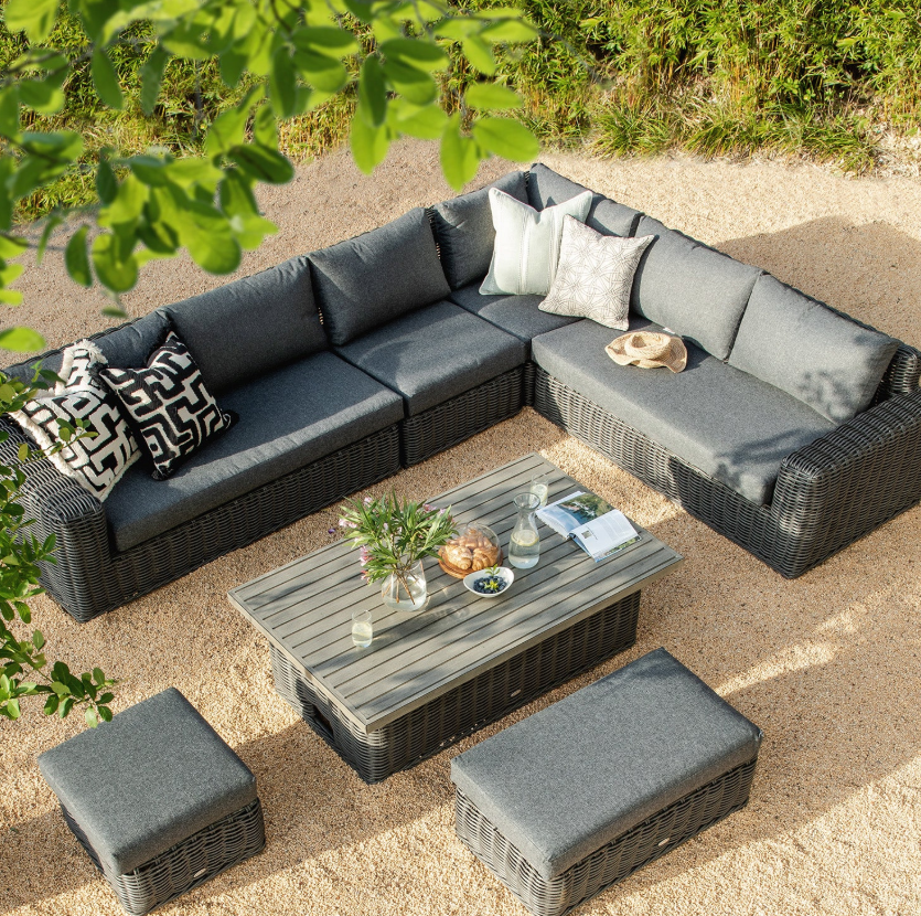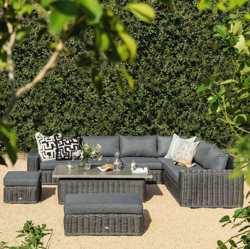 - Crafted from robust round all-weather wicker weaves and internal aluminium frames, the hard-wearing outdoor set comprises a large corner sofa as well as a bench and footstool, providing plenty of seating space for those outdoor tea parties.