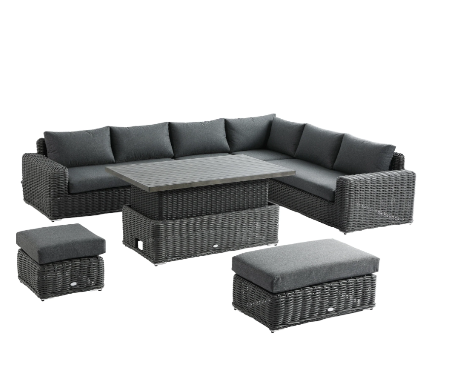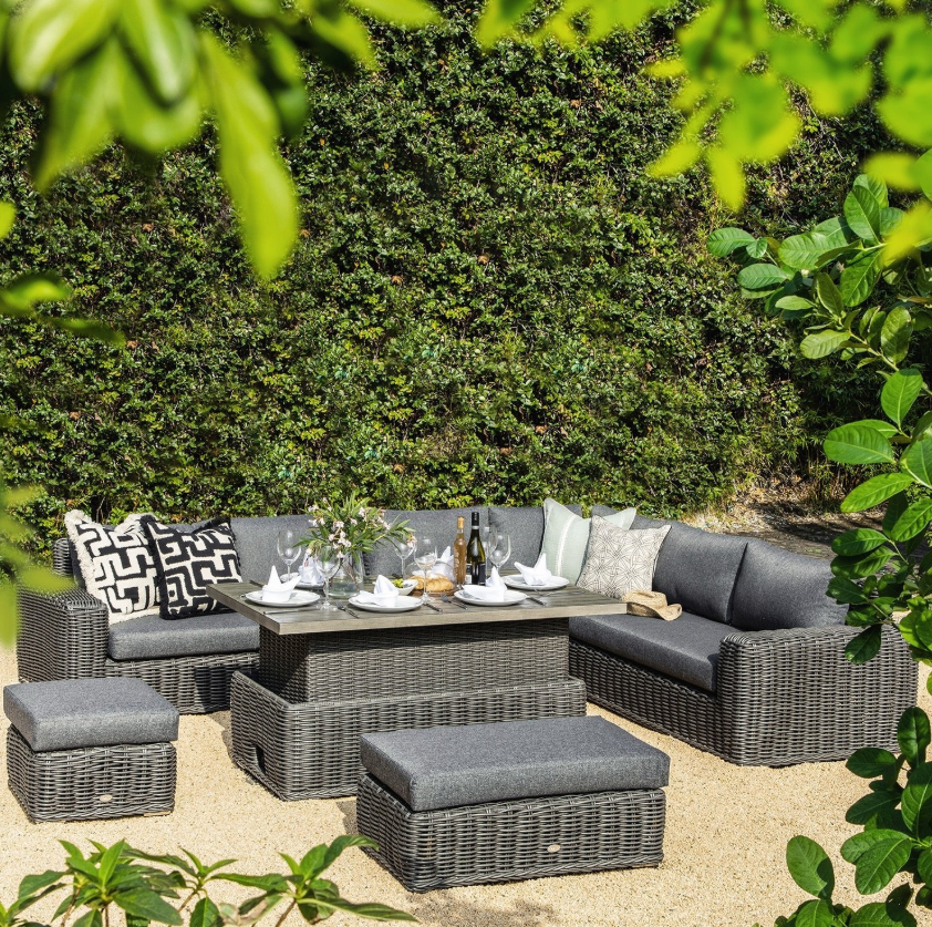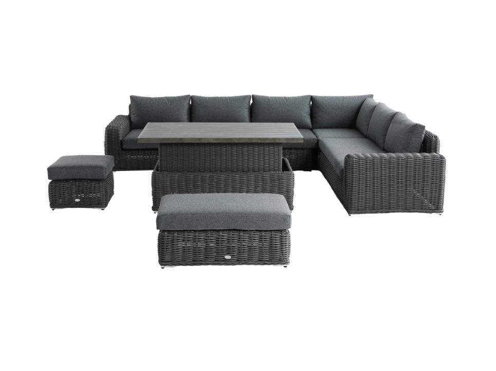 - The set comes with an easy-to-use slatted aluminium rising table with a brushed wooden effect finish, transforming the set from a perfect lounging set to a dining set with minimal effort.
