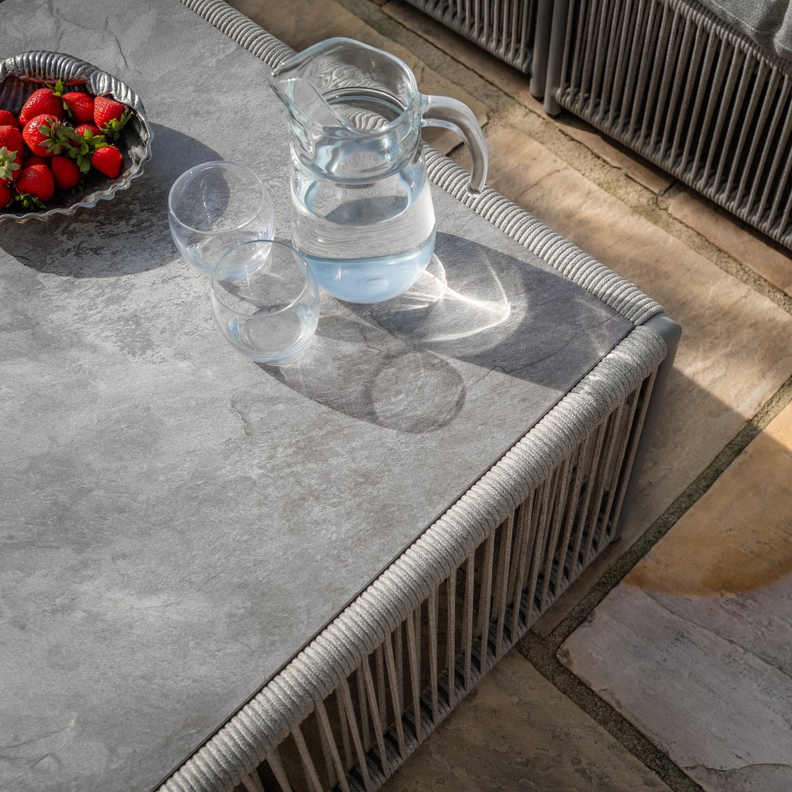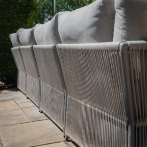 Each section is topped with soft, inviting seat cushions, providing the ultimate comfort for relaxing outdoors. The durable dawn grey aluminium frames ensure longevity, while the cool grey with a hint of beige woven into the cushions bring a cosy, relaxed vibe. The set also includes a stylish square coffee table, finished with the same elegant rope detailing and a luxurious marble-effect ceramic glass table top, adding a touch of sophistication and functionality to your outdoor space.