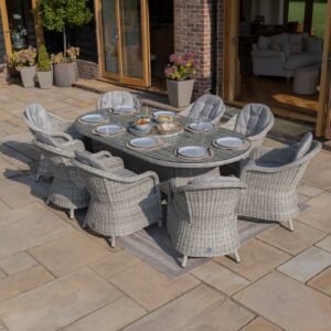 The Oxford 8 Seat Oval Dining Set with Heritage Chairs brings a refined touch of luxury to your outdoor dining experience. Crafted from premium rattan, the oval dining table features a durable toughened glass top that is both elegant and easy to clean. The eight high-back dining chairs are designed for comfort, each one offering padded base and back cushions, ensuring that your guests can relax in style. The neutral grey tones of the set blend seamlessly with various garden styles, making it a versatile addition to any outdoor space.