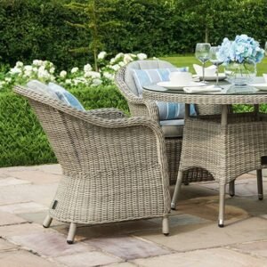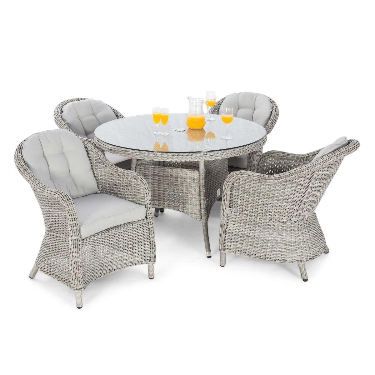 The Oxford 4 Seat Dining Set with Heritage Chairs brings a touch of luxury to your al fresco dining. The round table topped with toughened glass teamed with the four comfortable chairs complete with base and back cushions to make this the perfect set to share breakfast, lunch, or dinner!