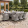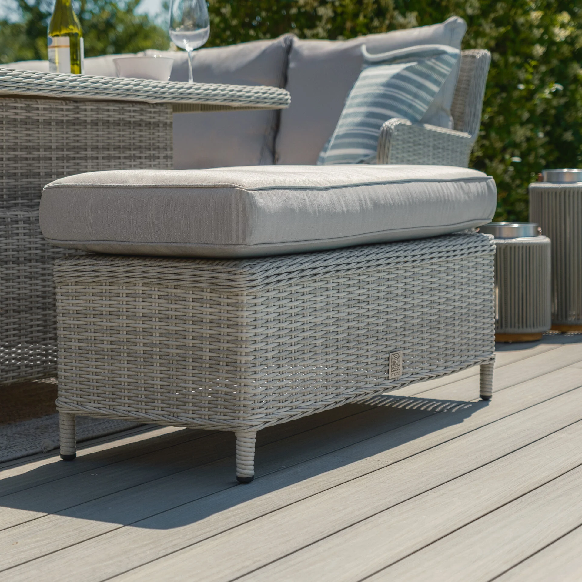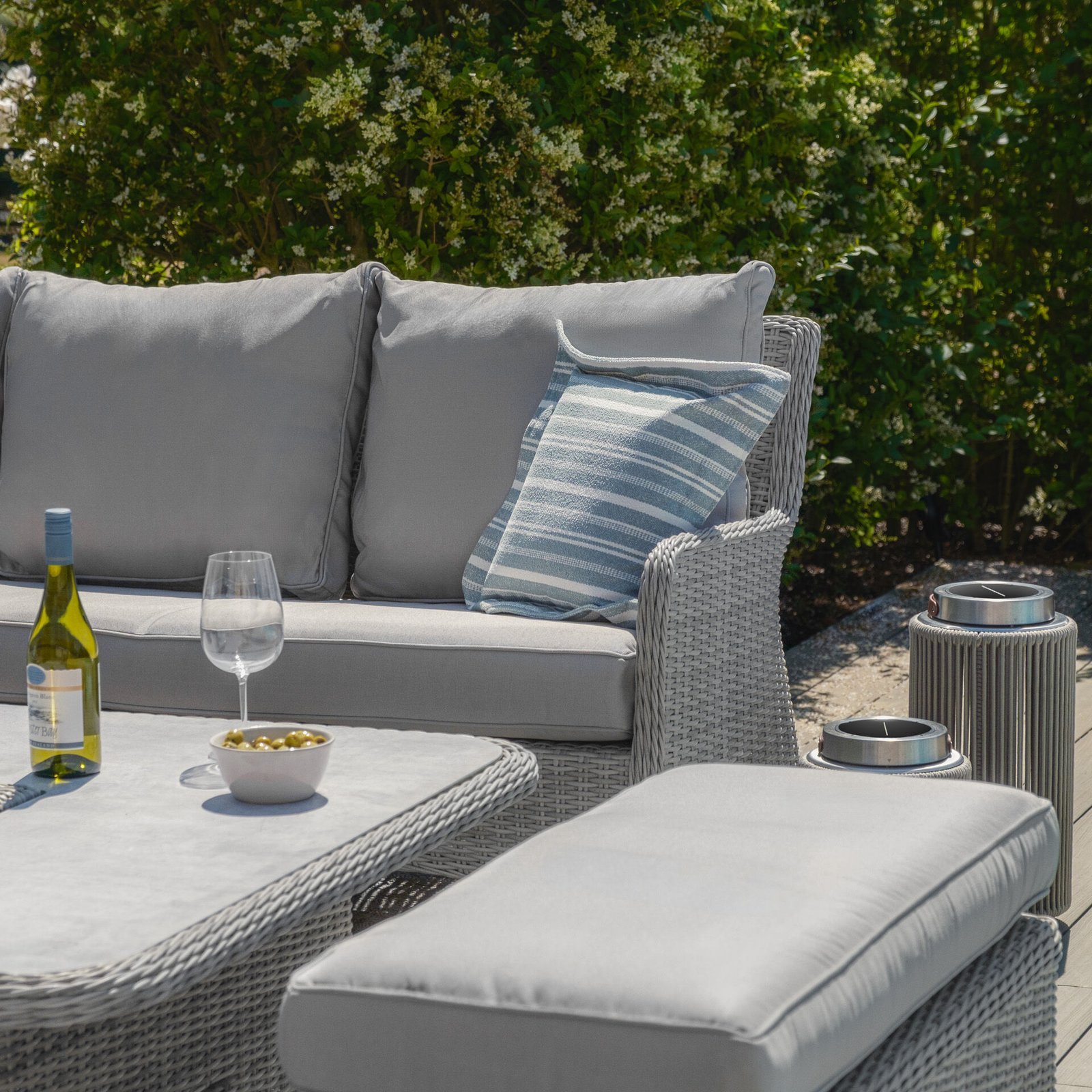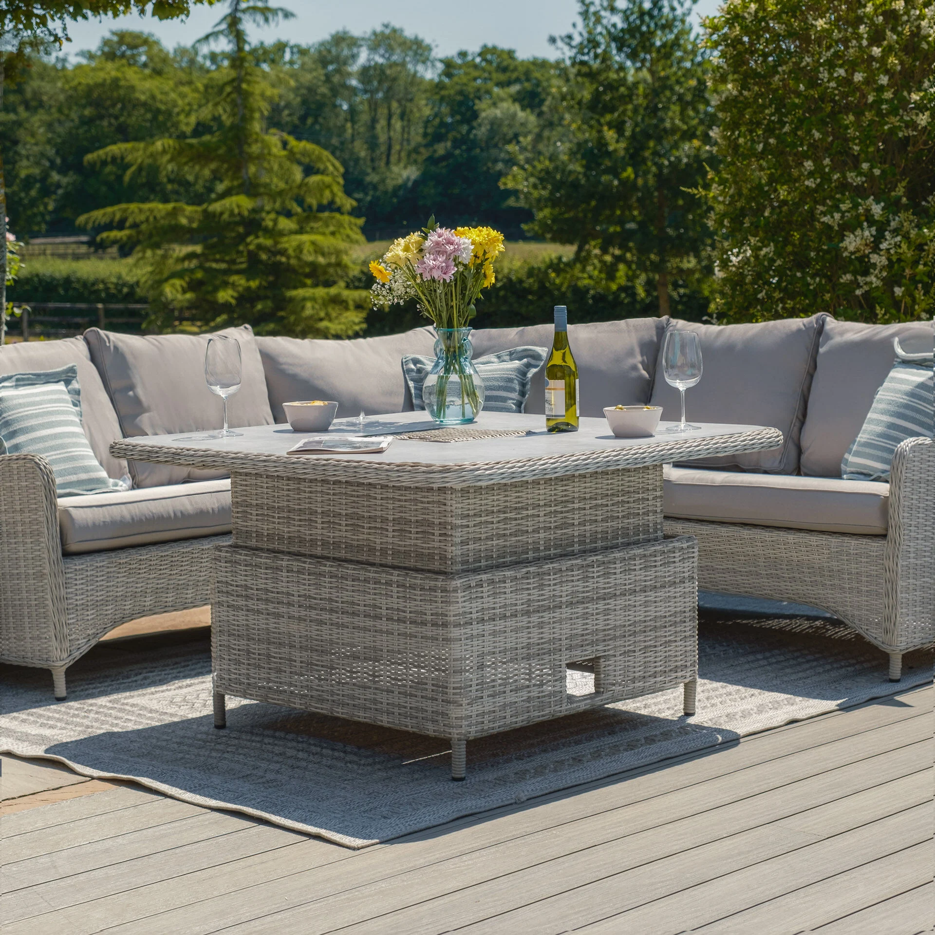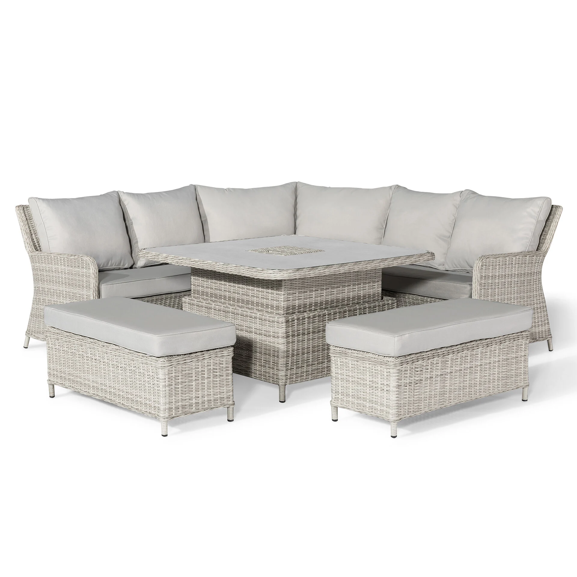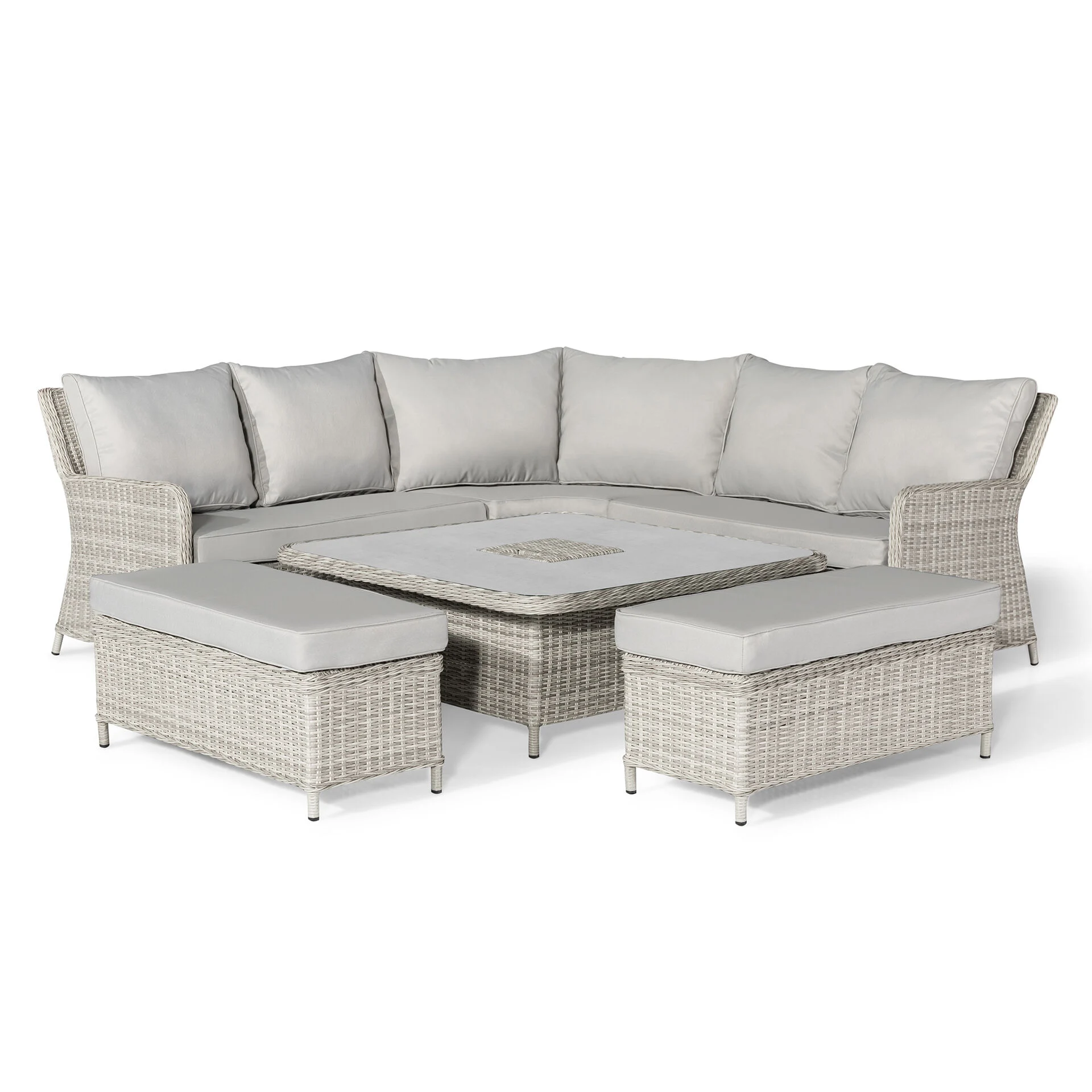 Elevate your outdoor living space with the elegant and functional Maze Oxford Royal Rattan Corner Dining Sofa Set. Designed for both comfort and versatility, this set features a contemporary rising table topped with a stylish light grey ceramic surface, allowing you to effortlessly switch from dining to lounging. The integrated ice bucket at the centre of the table adds a luxurious touch, keeping your drinks cool and your guests refreshed.