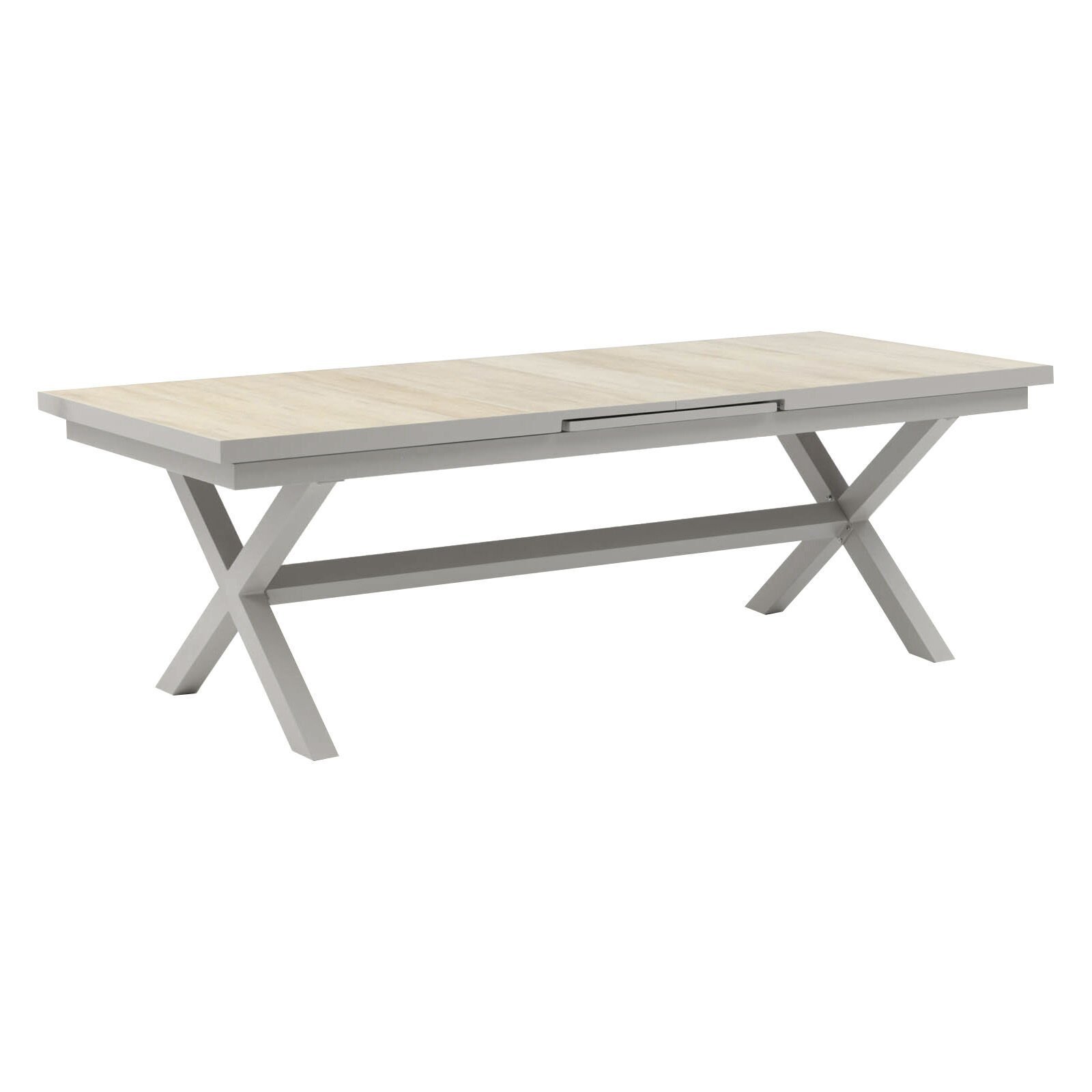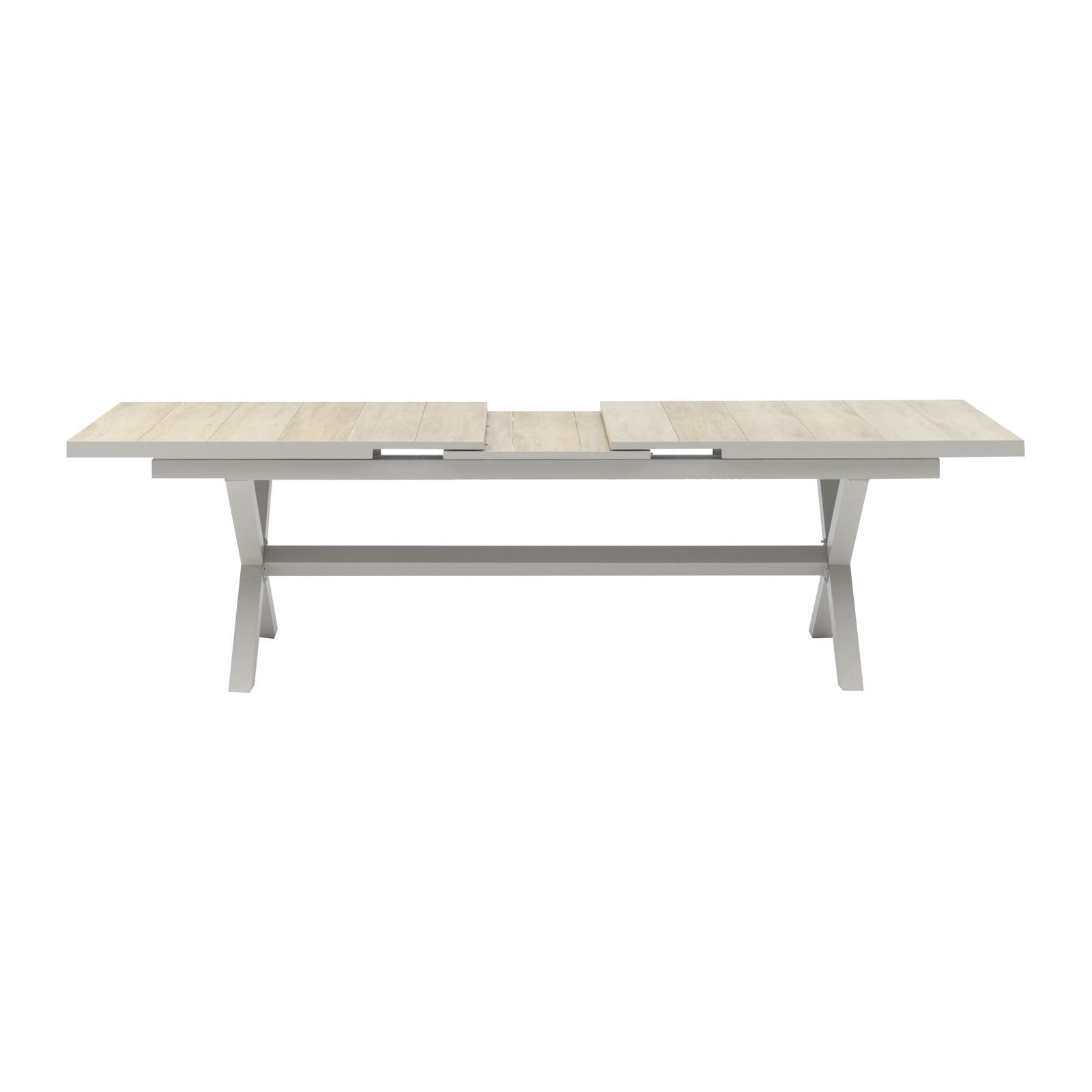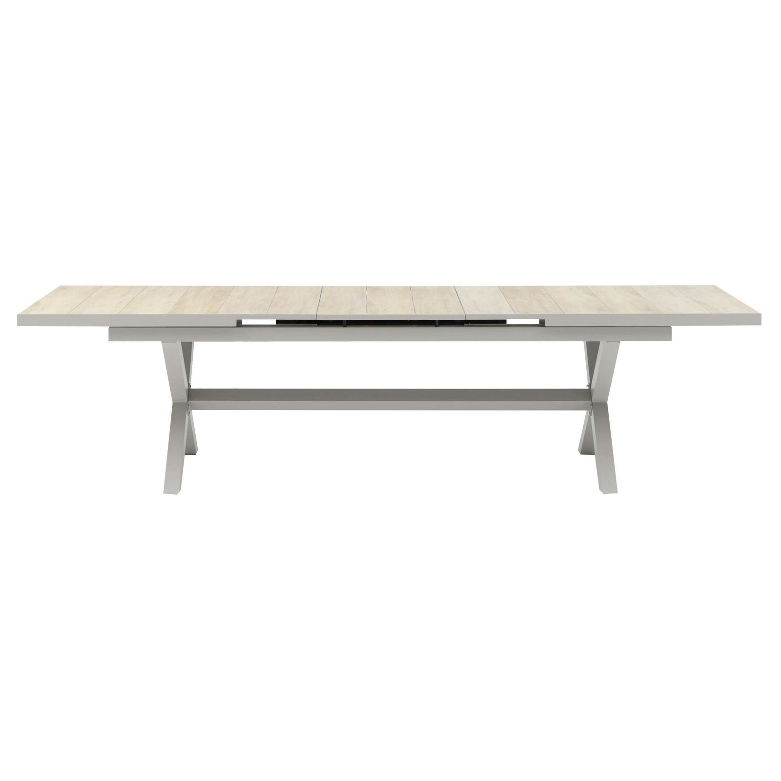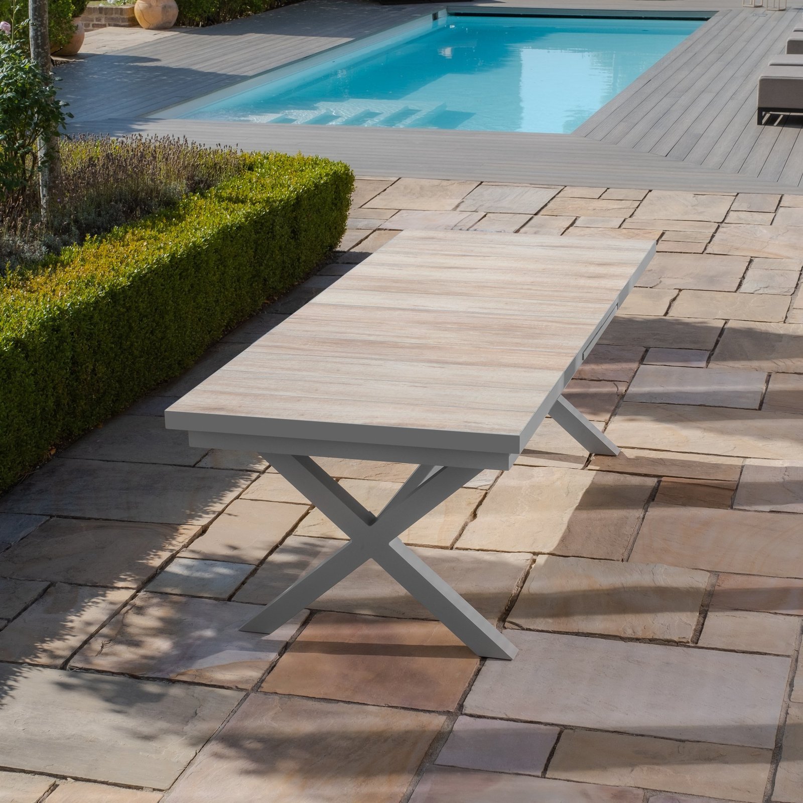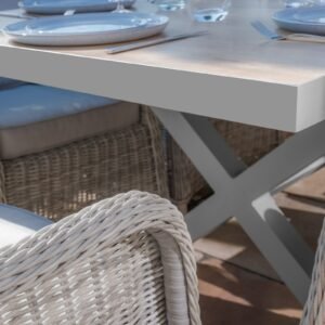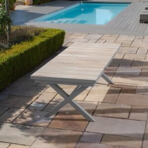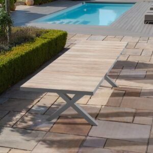 The Vienna table is as strong as it is stylish, featuring elegant cross legs at each end and a stabilising bar between for added strength and stability. The tabletop is designed with three distinct sections, each incorporating wood-effect ceramic tiles that provide a premium, natural finish while remaining weather-resistant and easy to maintain.